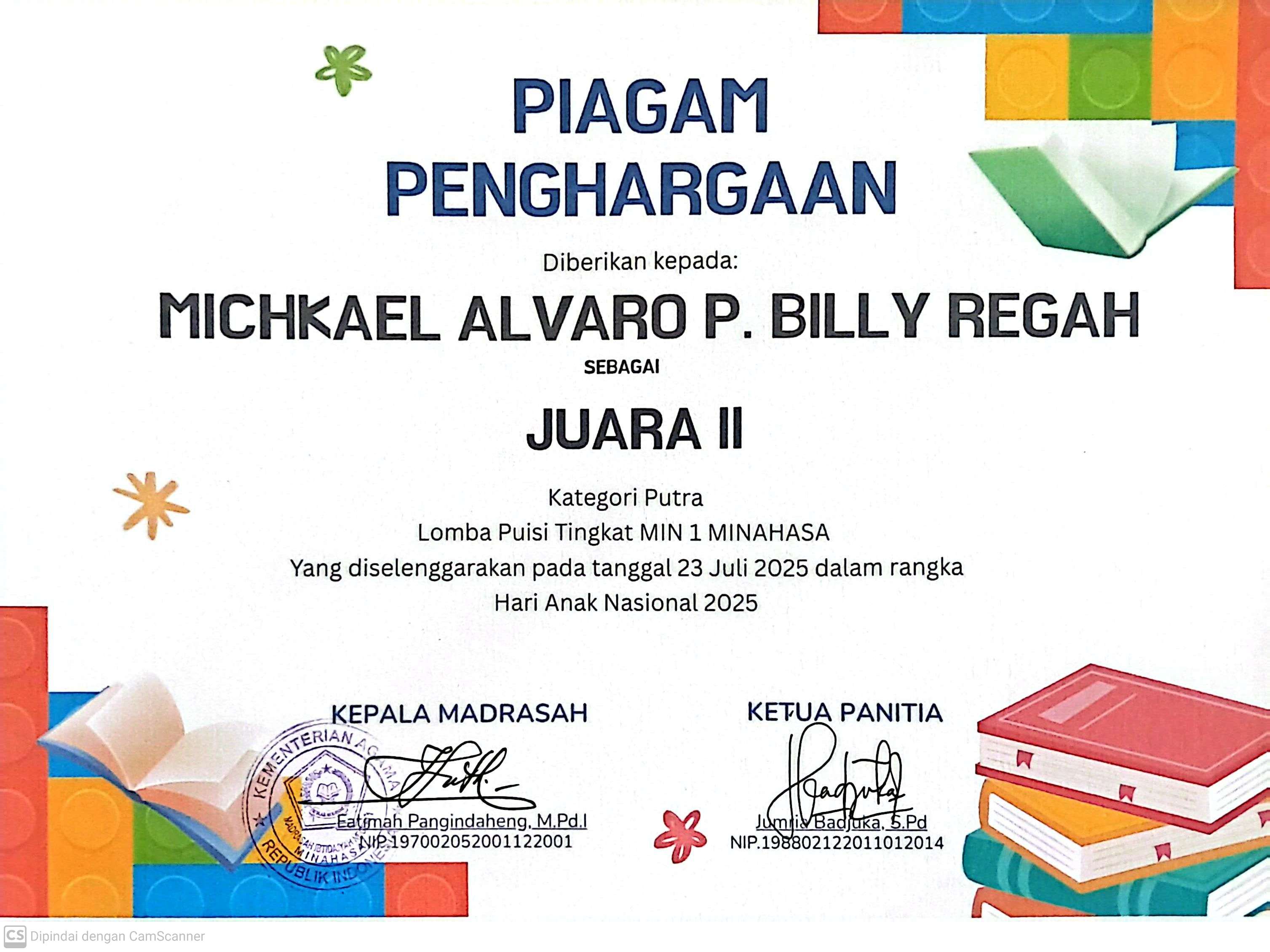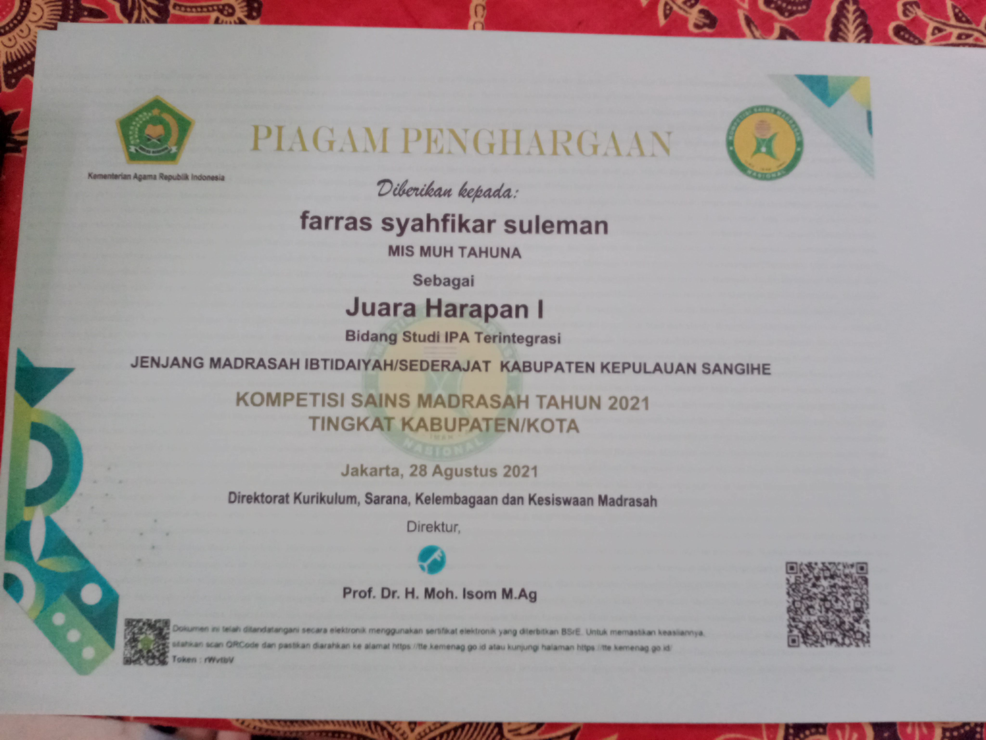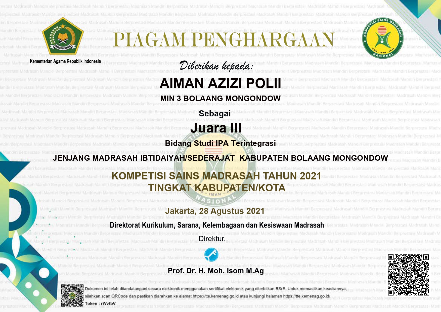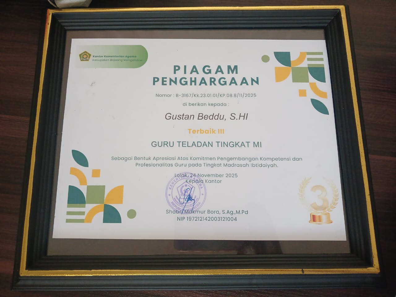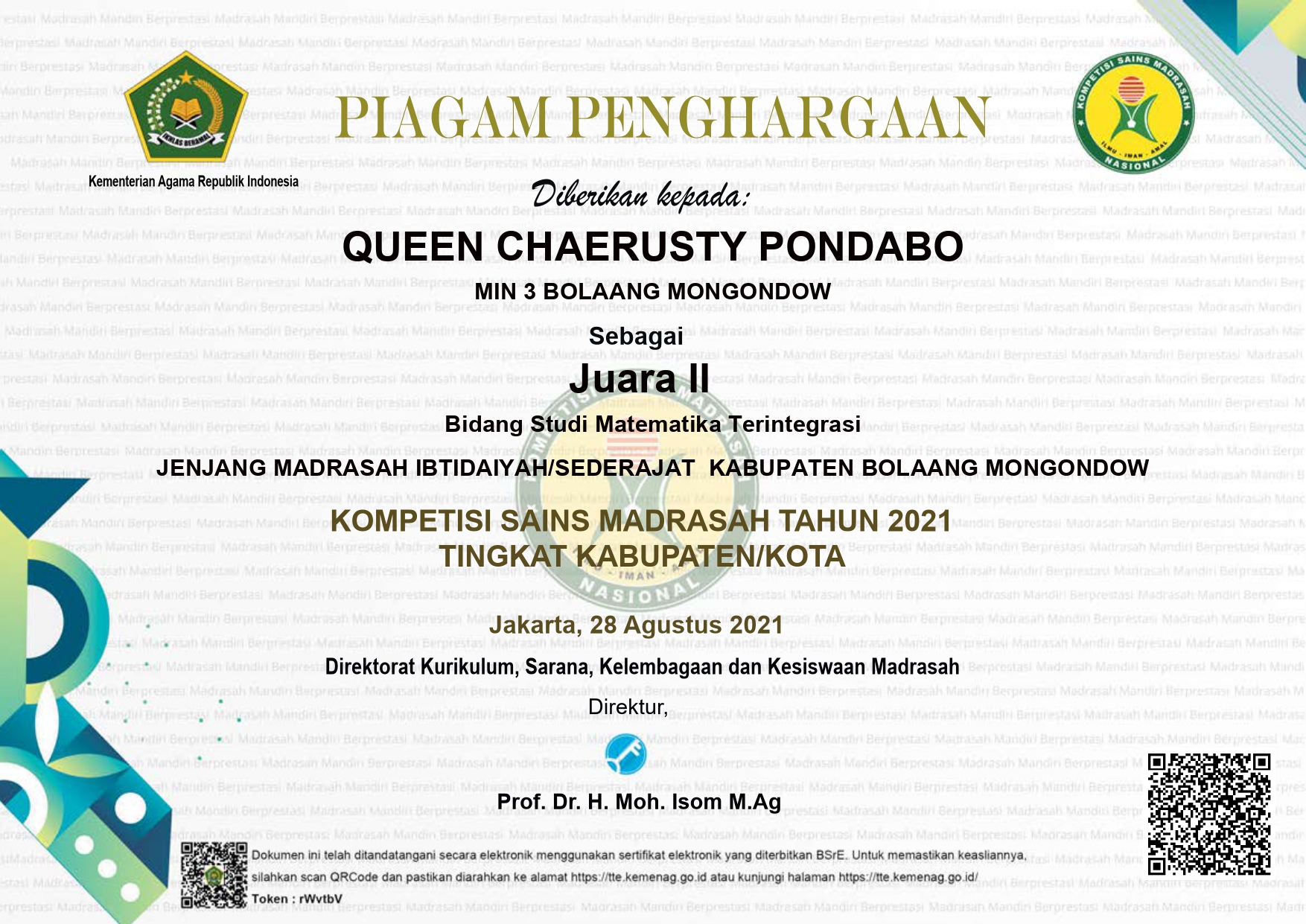 - cabang Kepala Madrasah yang paling Disiplin, Kreatif dan Inovatif dalam menjalankan Tugas