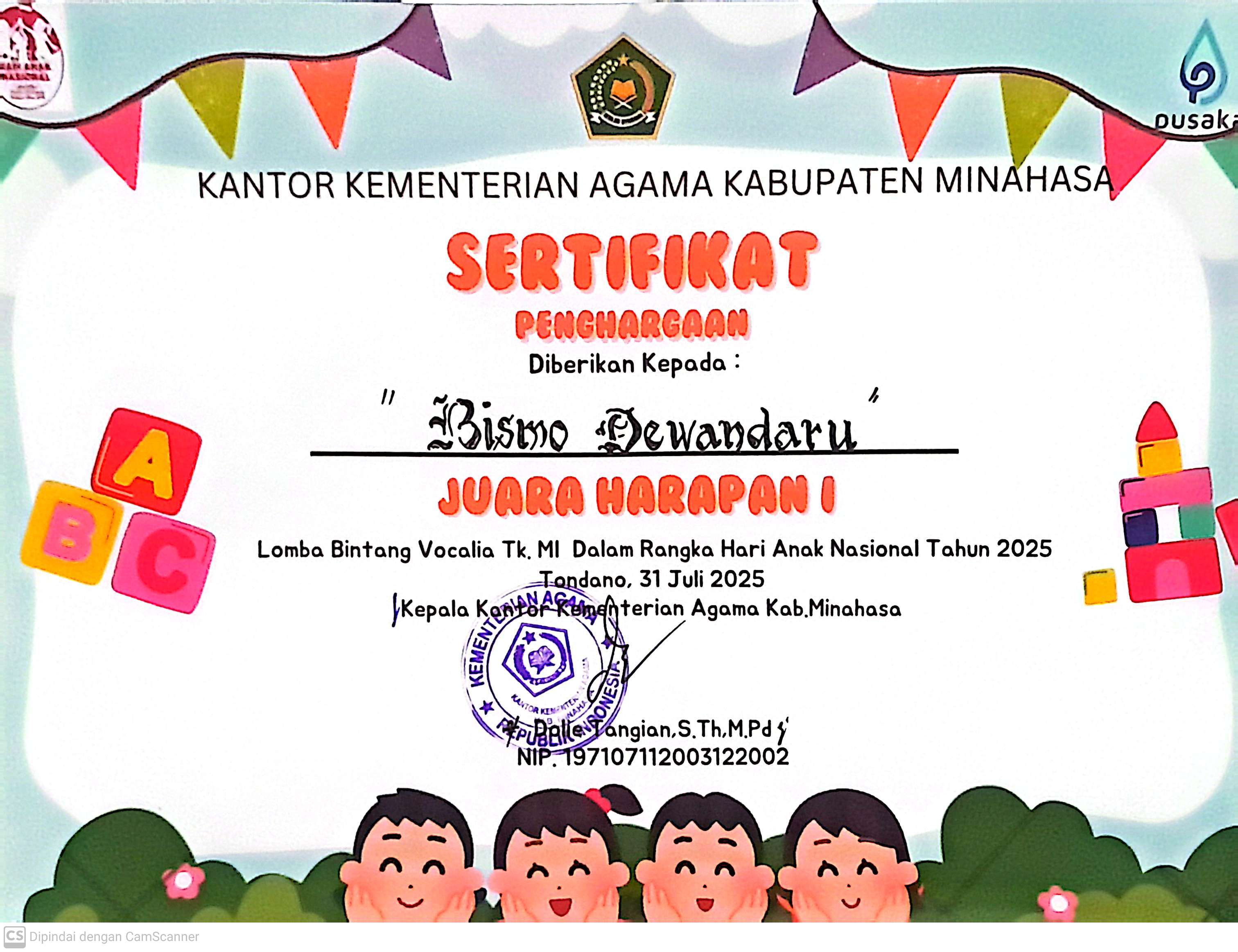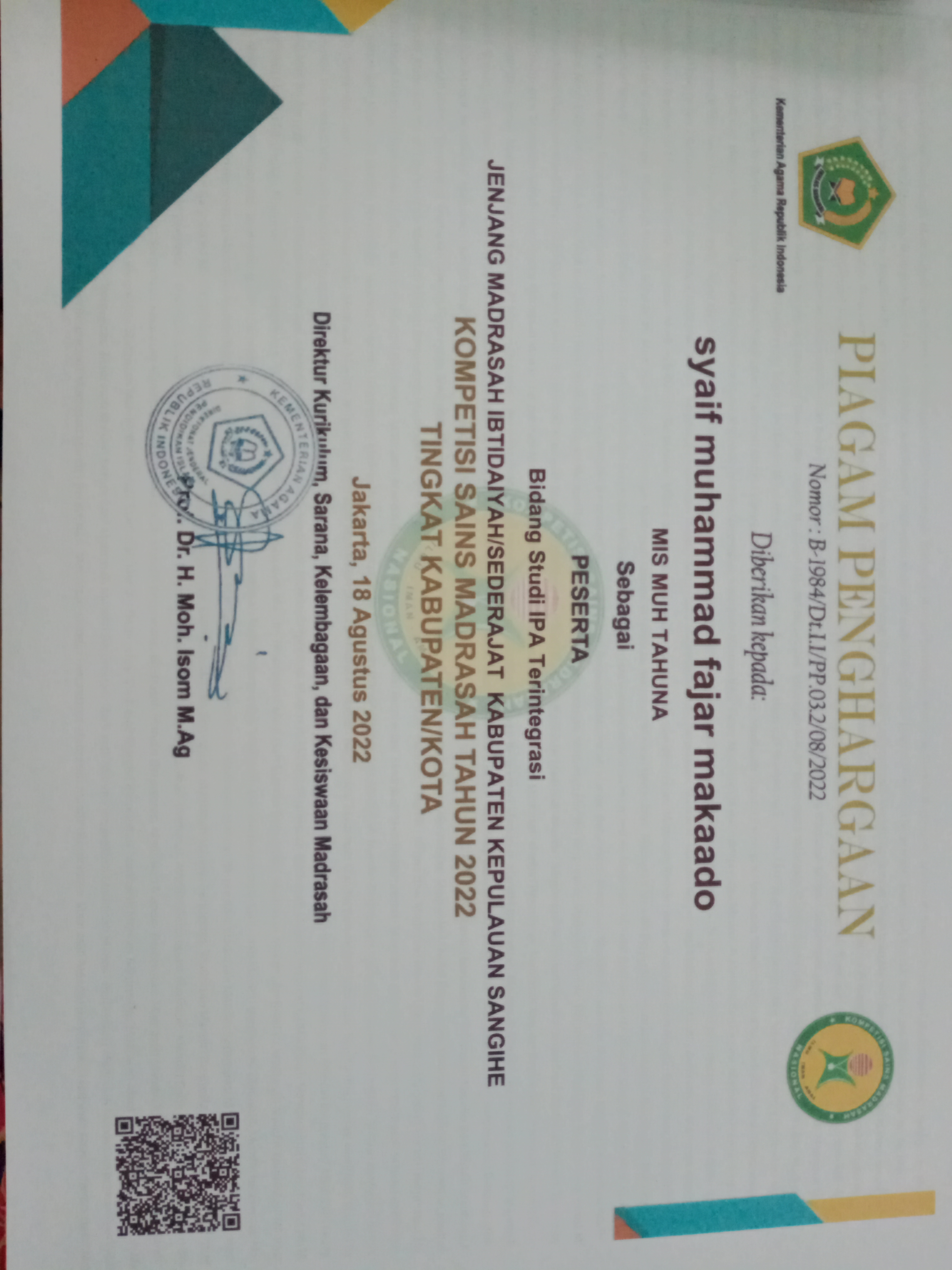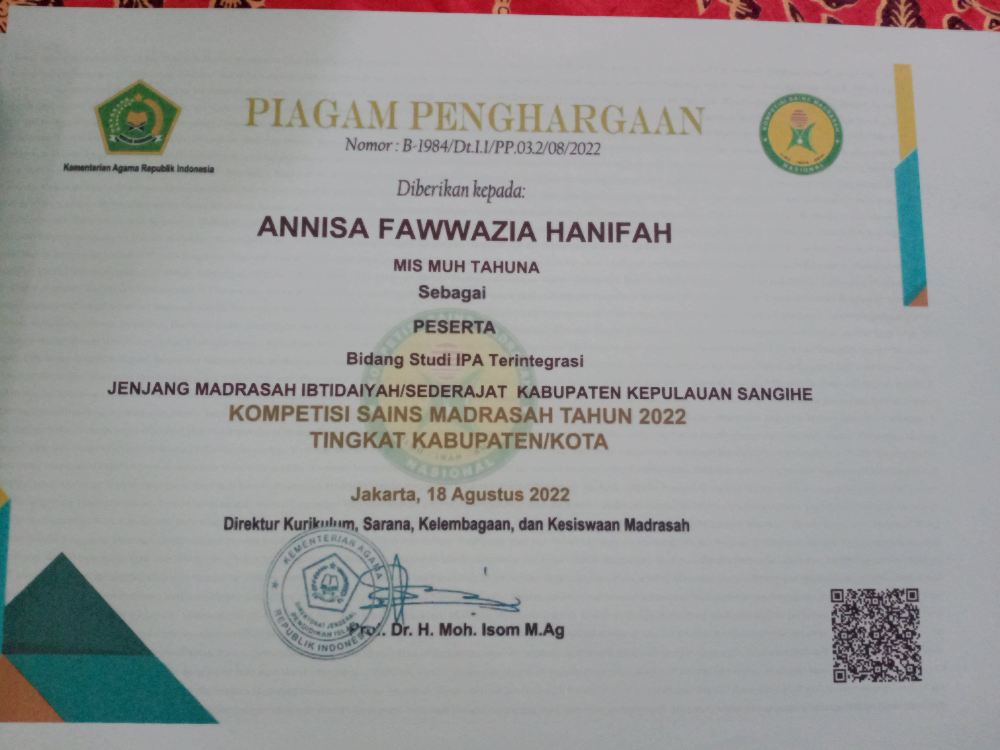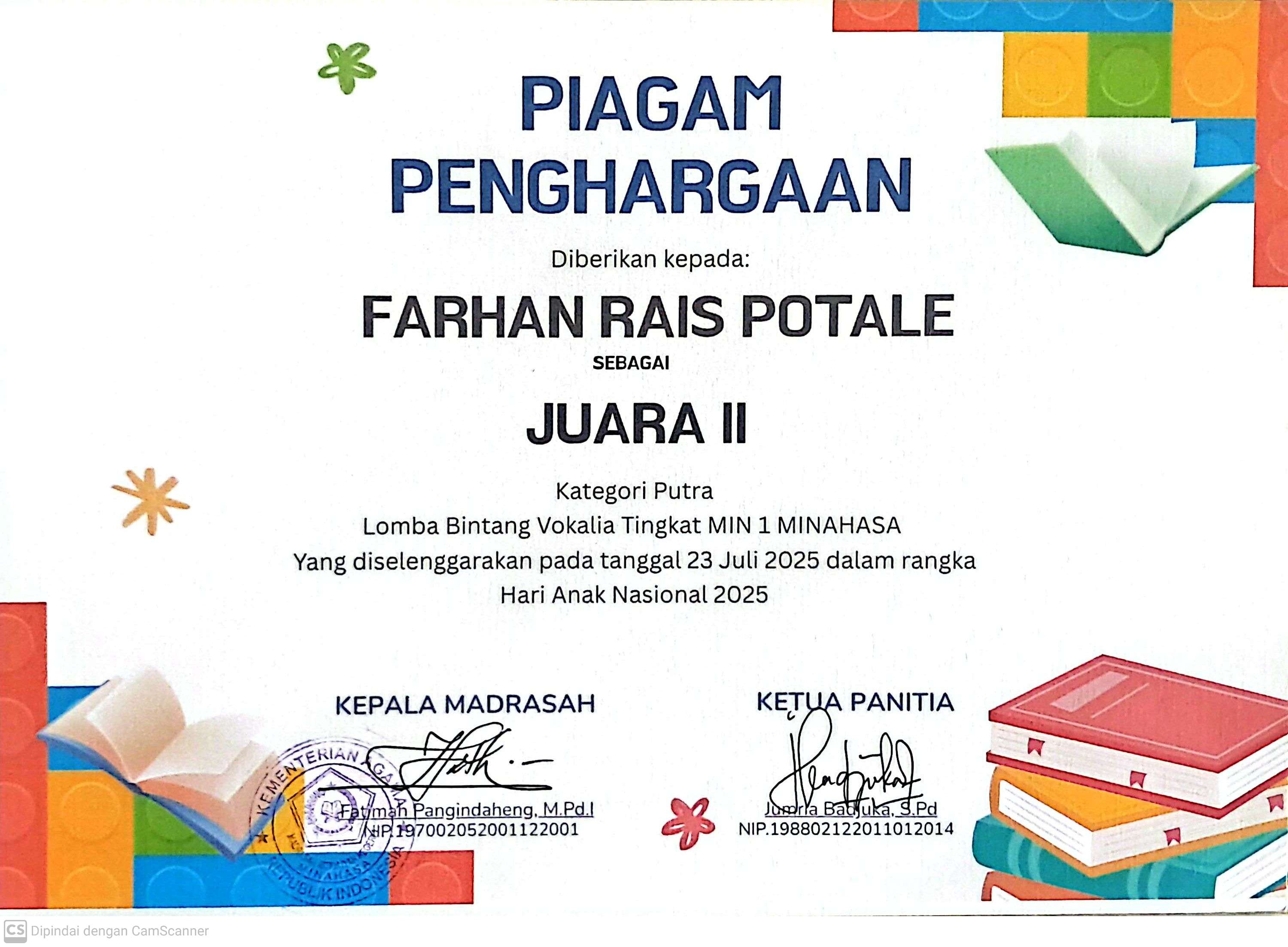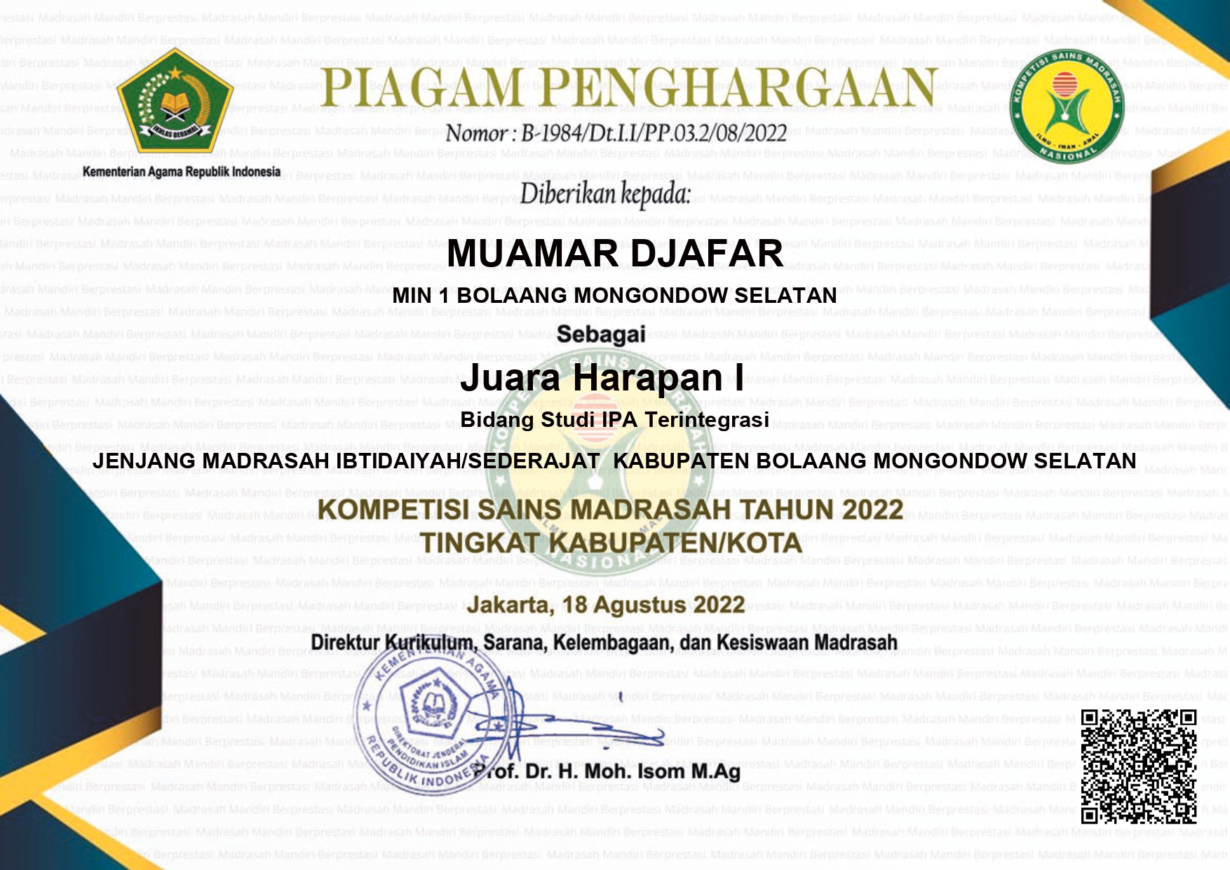 - cabang Kepala Madrasah yang paling Disiplin, Kreatif dan Inovatif dalam menjalankan Tugas