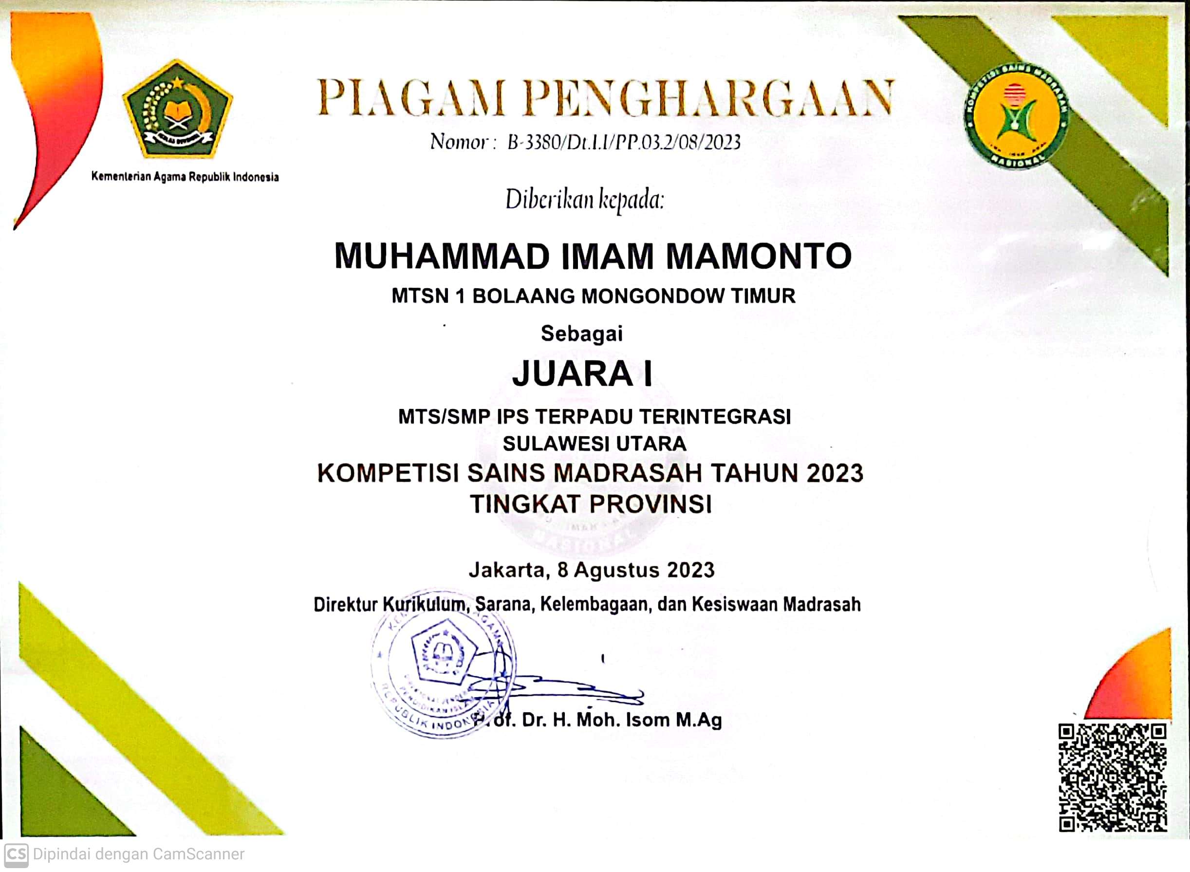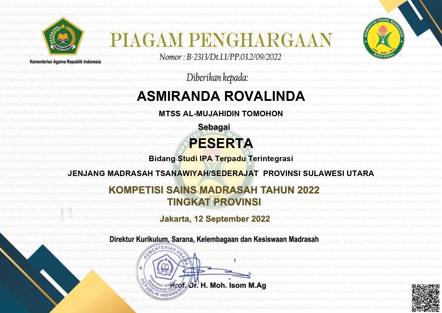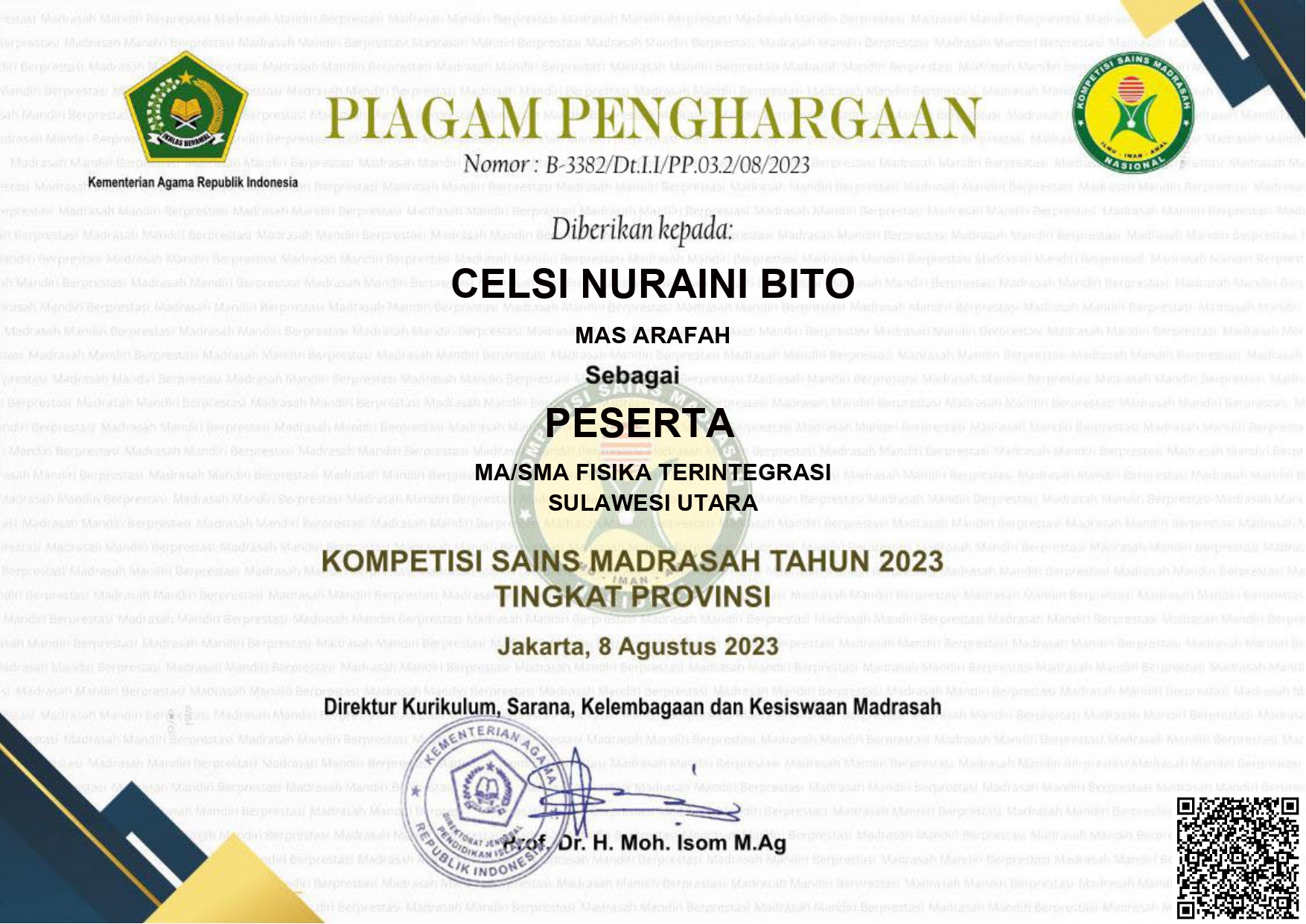 Siswa an. MUHAMMAD ISHAQ BAGINDO |