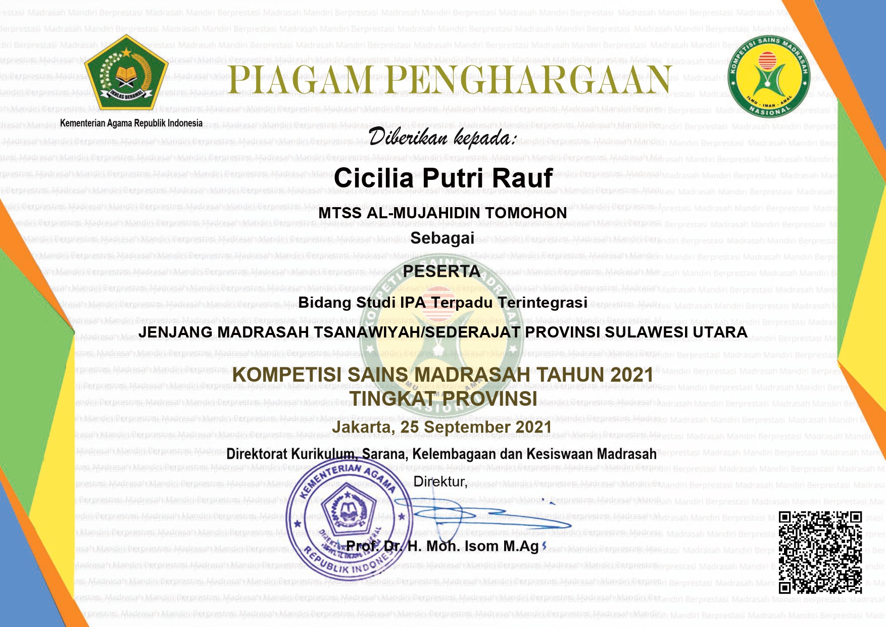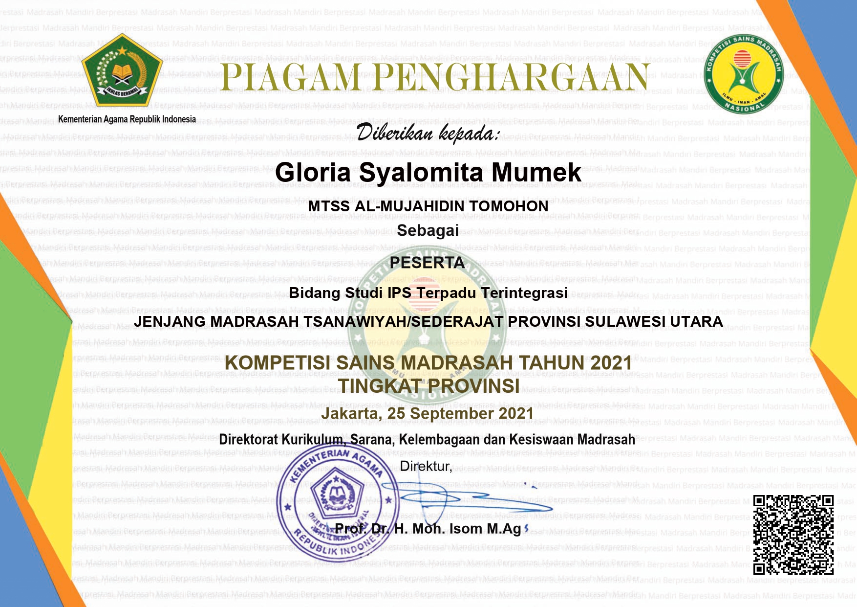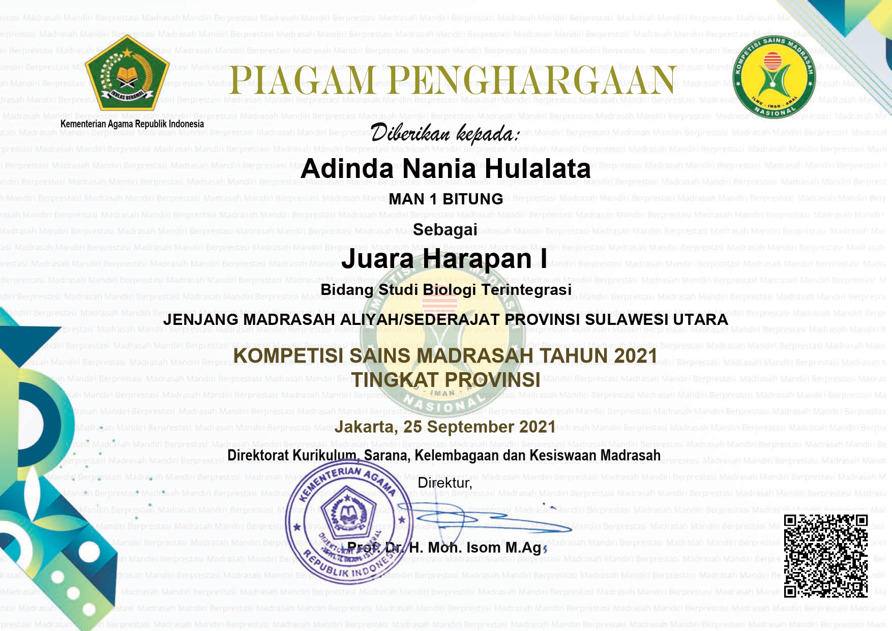 Kemenag RI, tingkat Provinsi Sulut tgl. 25 September 2021 di MIN 1 BITUNG |